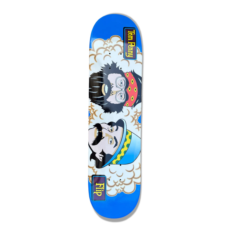 The original Toms Friends Cheech and Chong blue color way graphic in 7.75 inch size. 7-ply Canadian hard Rock Maple cut out using the original Flip F-01 template from 1994.